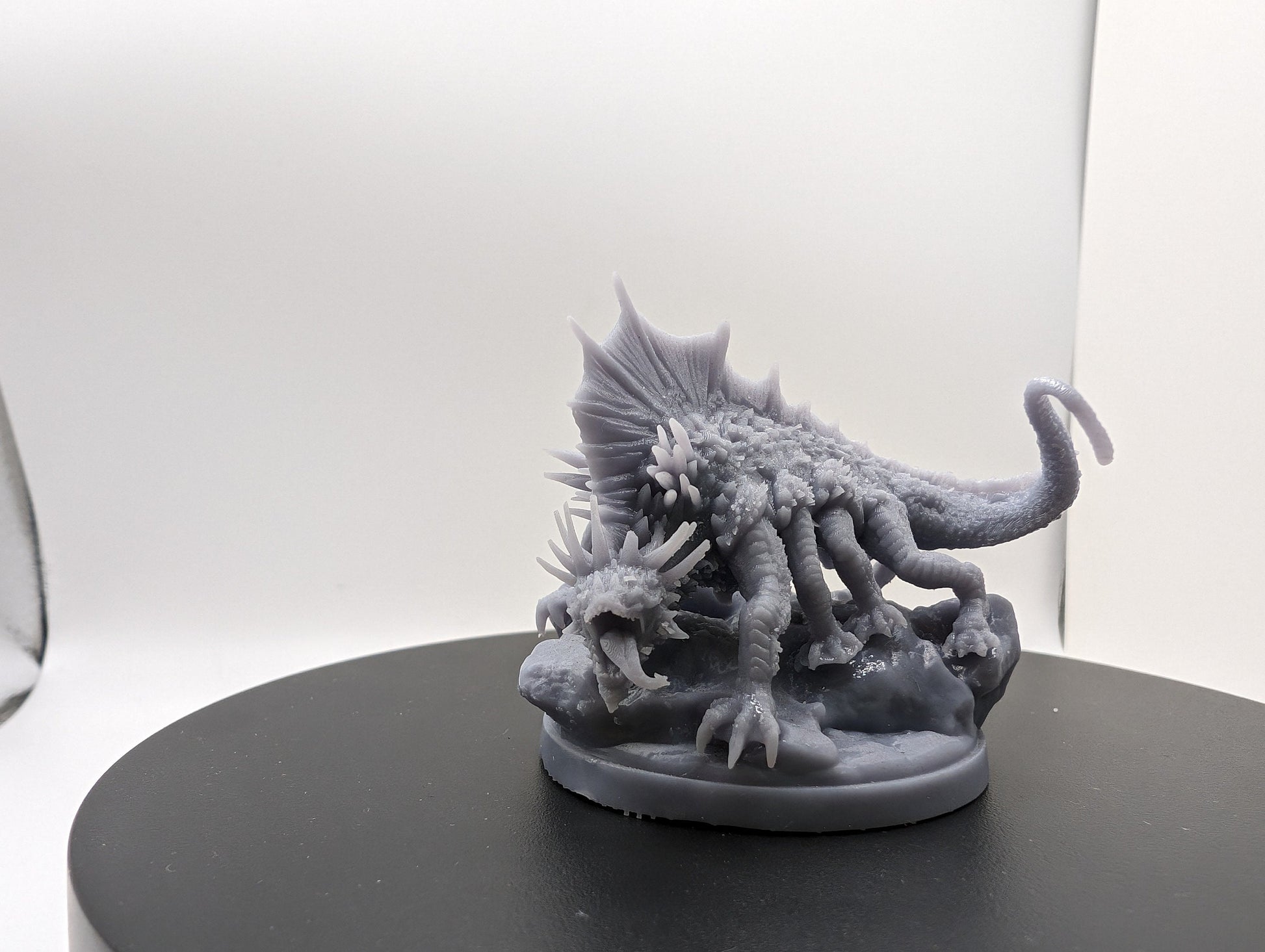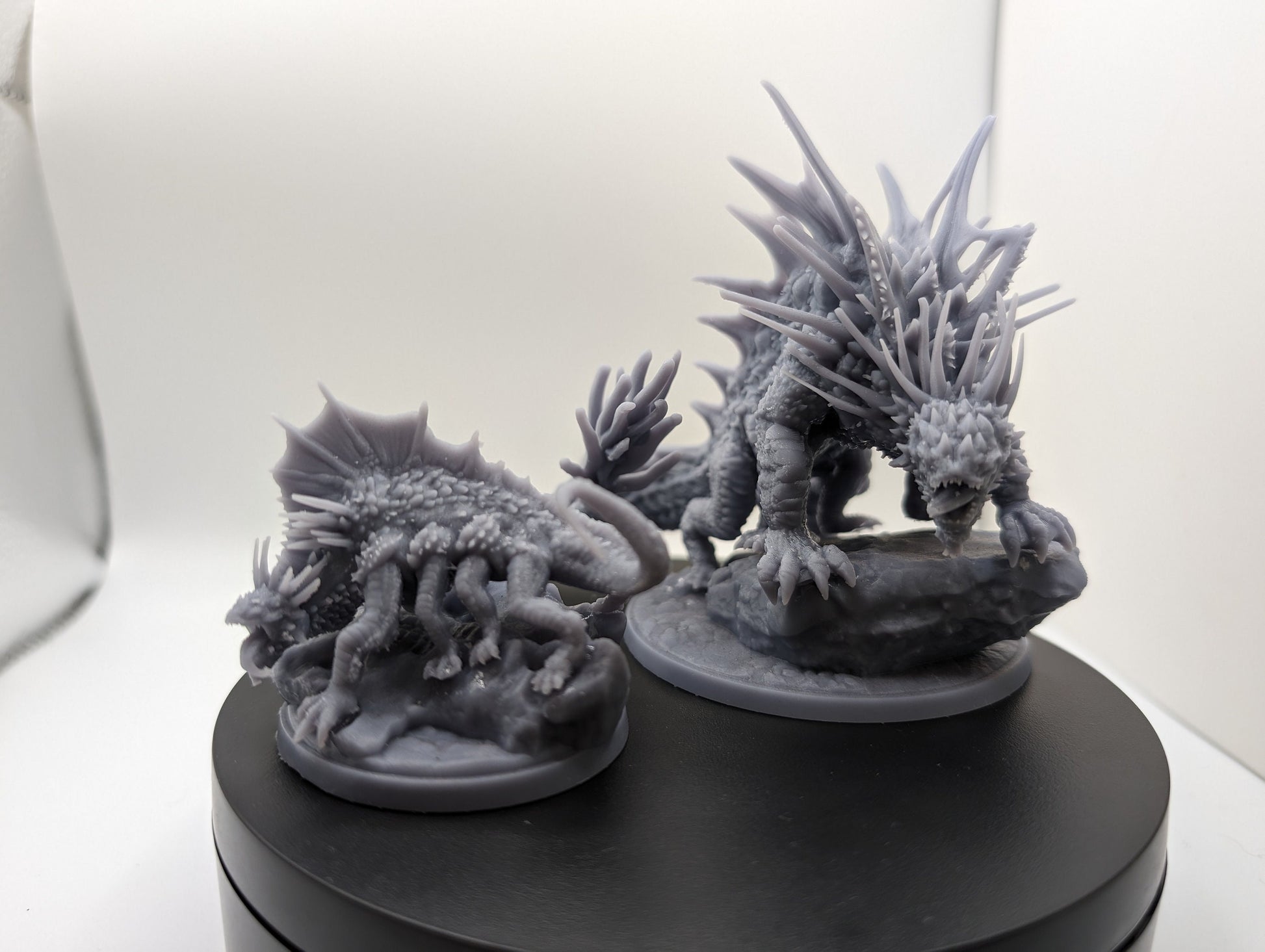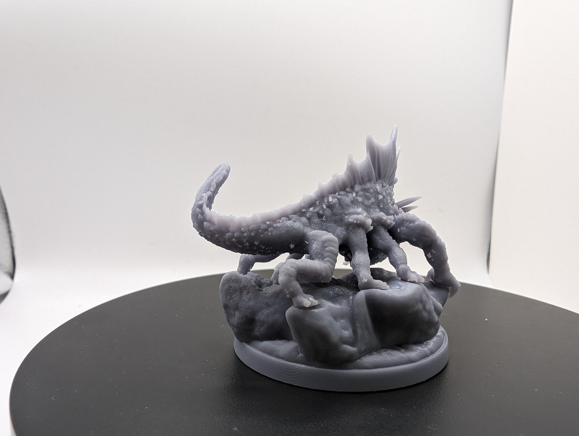 These fearsome giant lizards stalk along the river, with massive spikes and tail ready to crush the unwitting adventurer. The King Basilisk comes on a 32mm Scale and a custom 75mm base. Figures come separate from the custom bases. The Giant Basilisk comes on a 32mm Scale with a custom 50mm base.