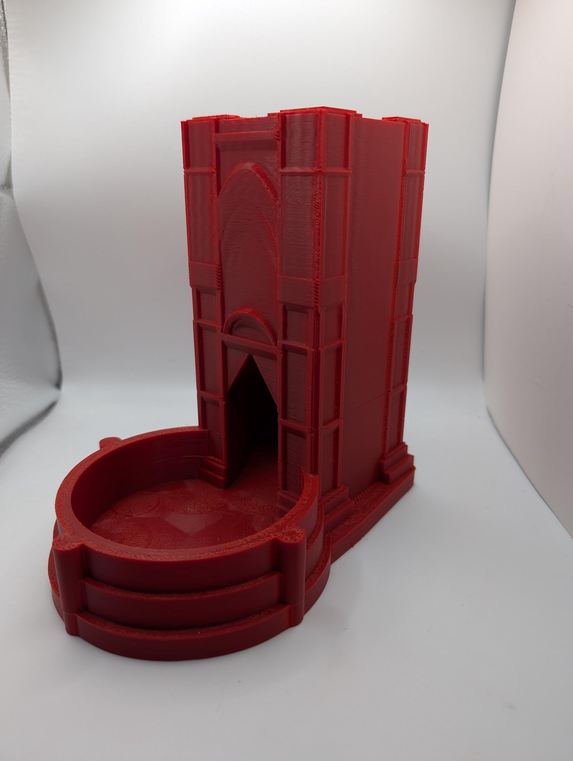 This sleek and symmetrical dice tower will be a great addition to your adventure! Dice can be rolled through the large opening in the top and end in the large tray at the bottom. It can accommodate standard-sized dice (22 mm) and larger (28 mm) dice, such as the popular liquid core dice. The tower stands at 7 inches tall, with an approximately 7 x 5-inch base.