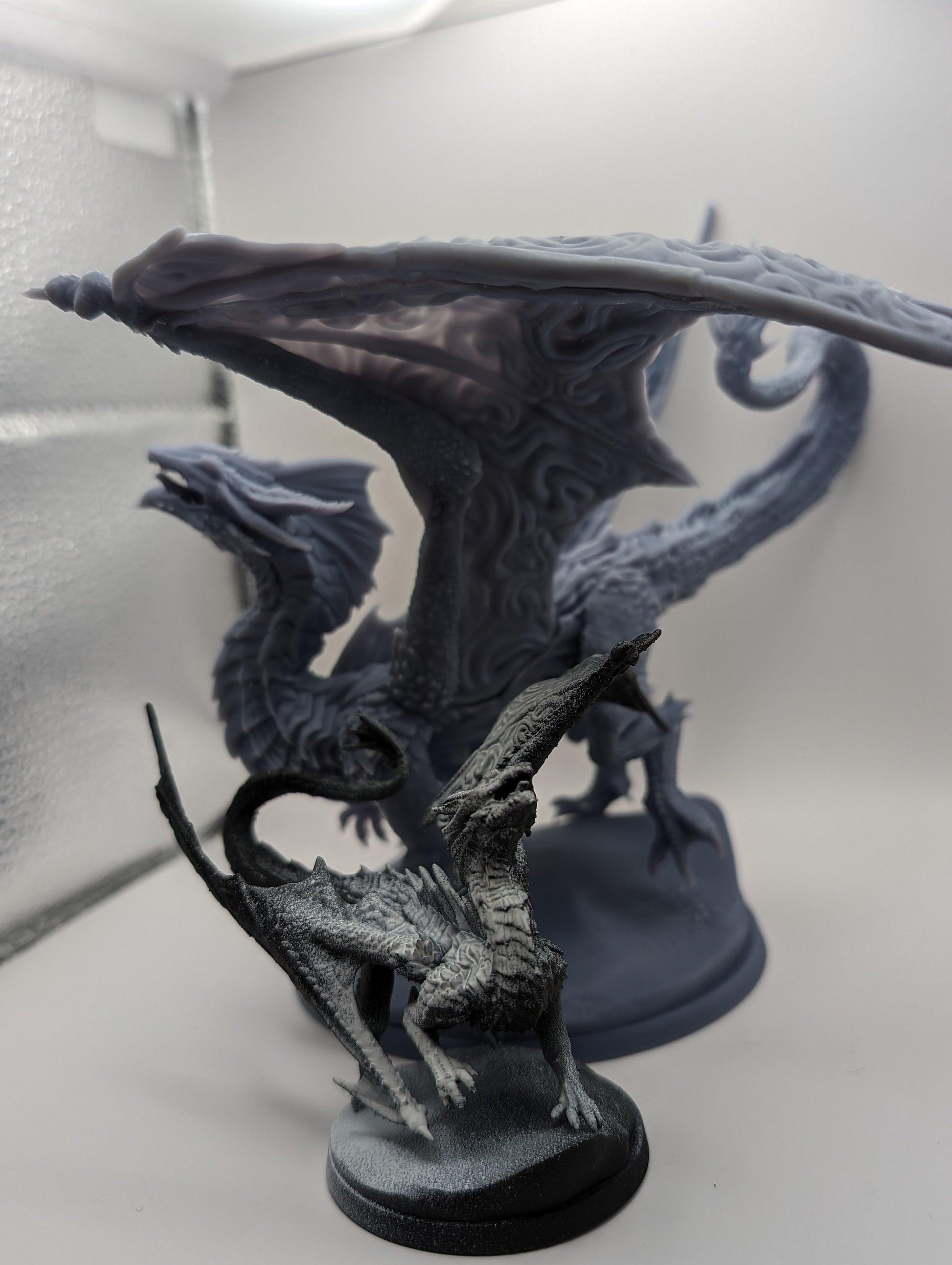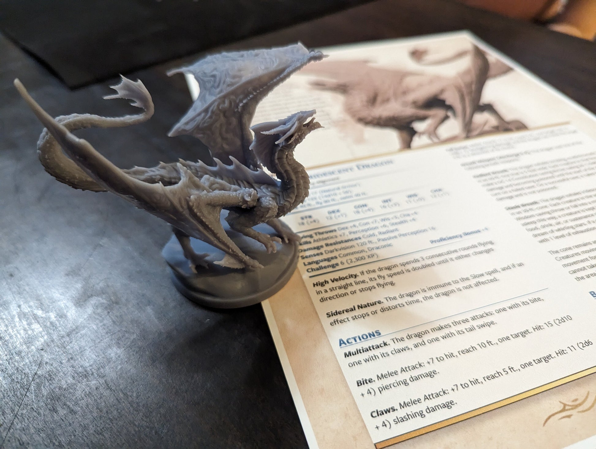This iridescent dragon mesmerizes with a swirling wing pattern. This dragon is a 32 mm scale and is printed separately from its 50 mm base.