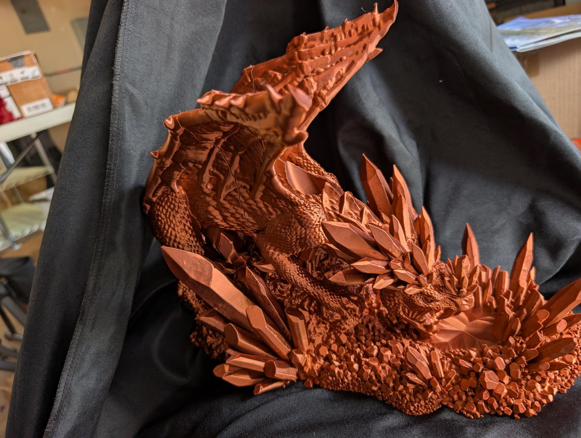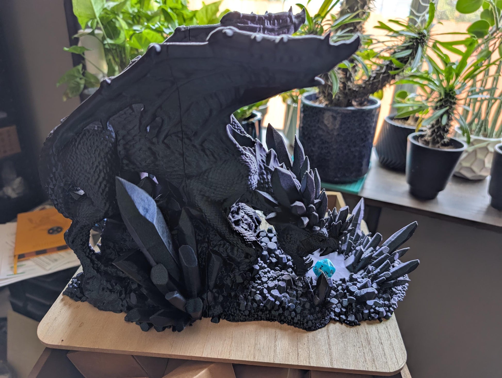 This detailed snake crawling up this tower makes for an impressive and unique dice tower that will be a great addition to your adventure! Dice are rolled through a hole in the back, ending at the bottom of the tower. It can only accommodate standard-sized dice (22 mm), but not the larger (28 mm) dice, such as the popular liquid core dice. The tower is about 10 inches tall and an approximately 13.5 x 6 inch base (with the tail and crystals extending a bit beyond the base).