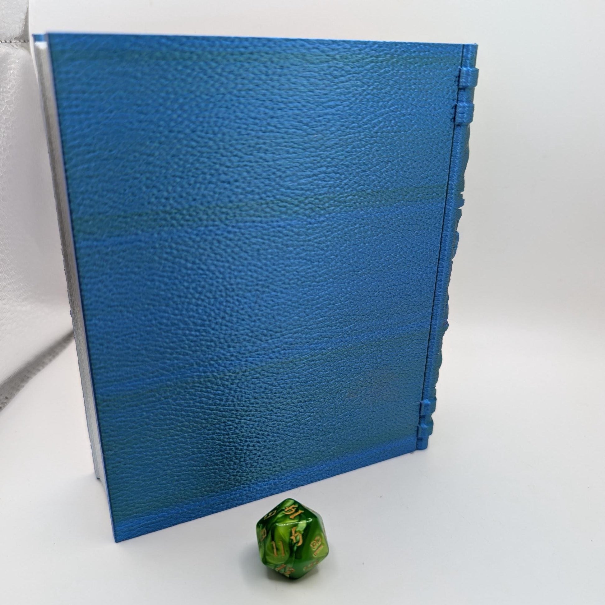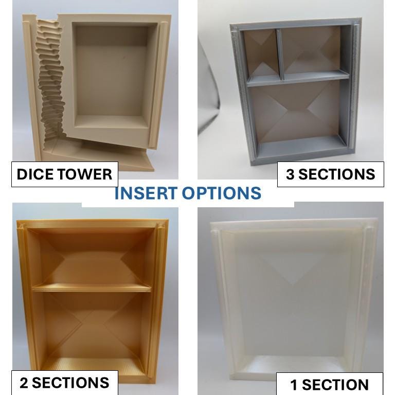 These tomes are perfect for travelling to your next adventure. whether carrying your dice, miniature, spell cards, or secret snacks! Select the color of the outside (or message us directly for a custom color), then choose between 4 differerent insert types (a dice tower with storage, 3 sections, working well for a mini, dice and spell cards or a usable dice tray, 2 sections or 1 large section for maximum storage or dice tray), then select the color you want the "pages" printed, from gold, tan, white, or silver. Small magnets are pre-installed to help keep the insert from slipping out accidentally.