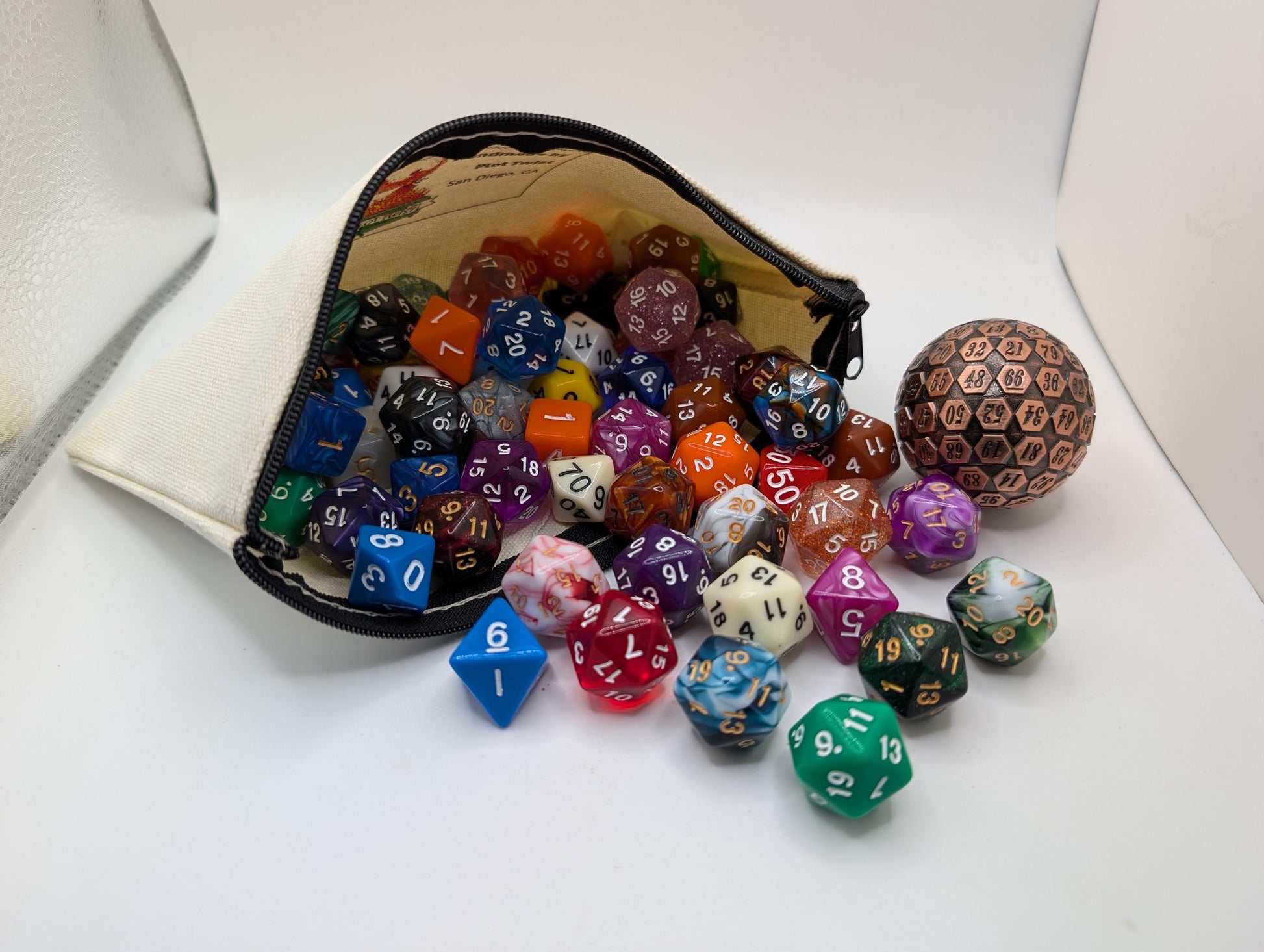 Our nerdy canvas storage bags can be used to hold anything from snacks, makeup, dice, pencils, travel items, and more. They are hand-made and measure 5 x 8.5 inches and close with a zipper.