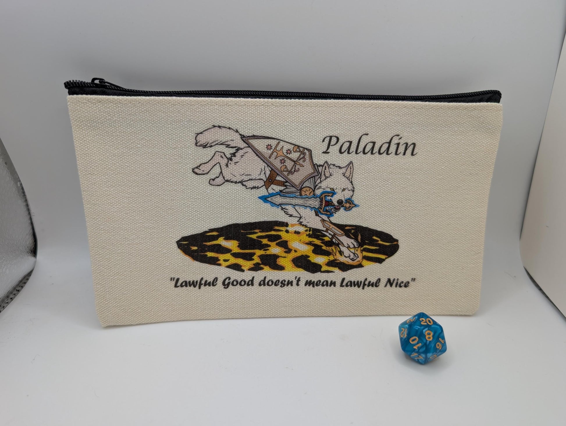 Need to keep your party from digressing to a band of murder hobos? Add a Paladin! But be careful not to get between them and their righteous fury! This powerful wolf is dressed as a paladin, complete with a glowing sword ready to smite, with the phrase "Lawful good doesn't mean Lawful nice" underneath.