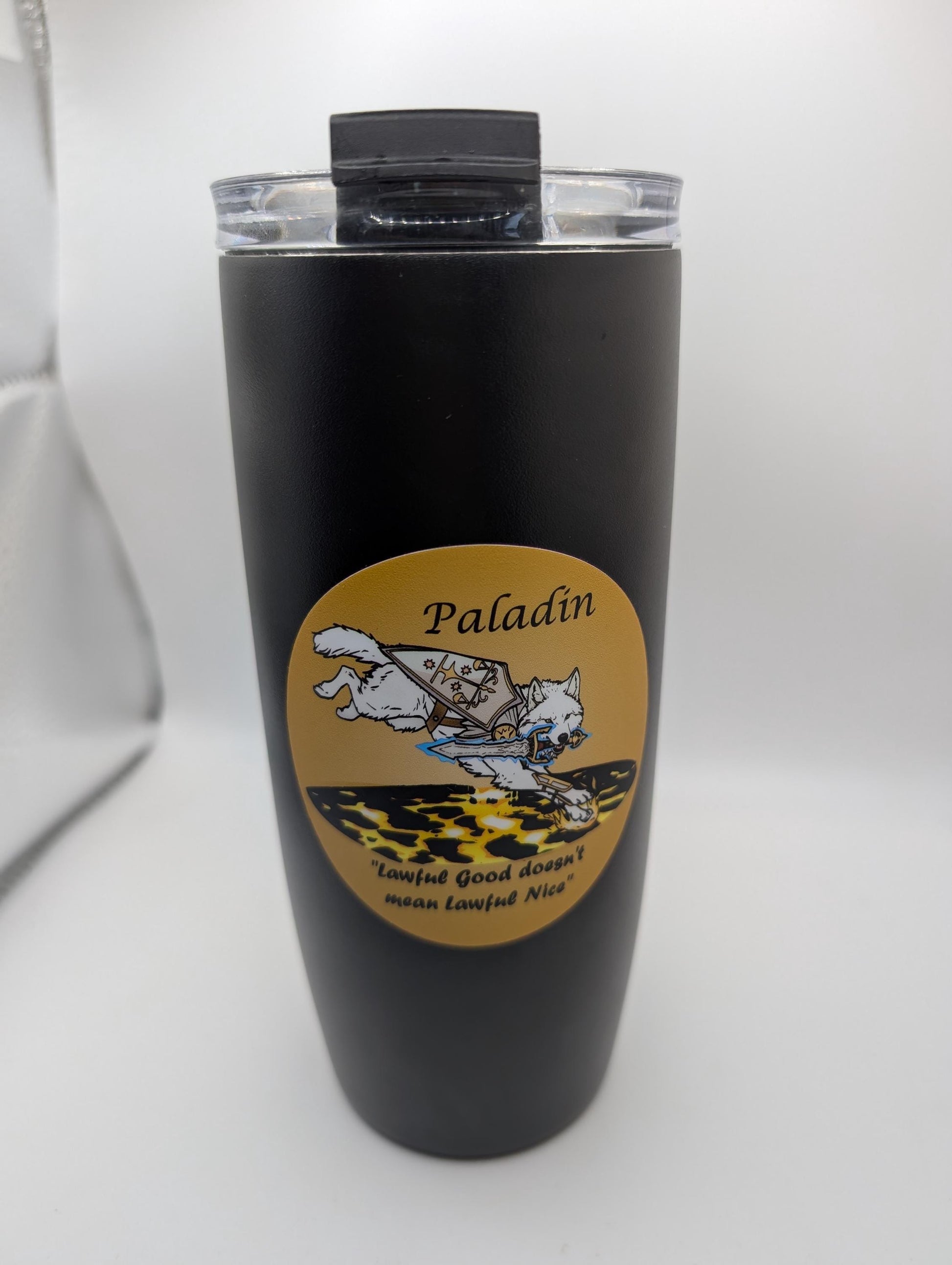 Need to keep your party from digressing to a band of murder hobos? Add a Paladin! But be careful not to get between them and their righteous fury! This powerful wolf is dressed as a paladin, complete with a glowing sword ready to smite, with the phrase "Lawful good doesn't mean Lawful nice" underneath.
