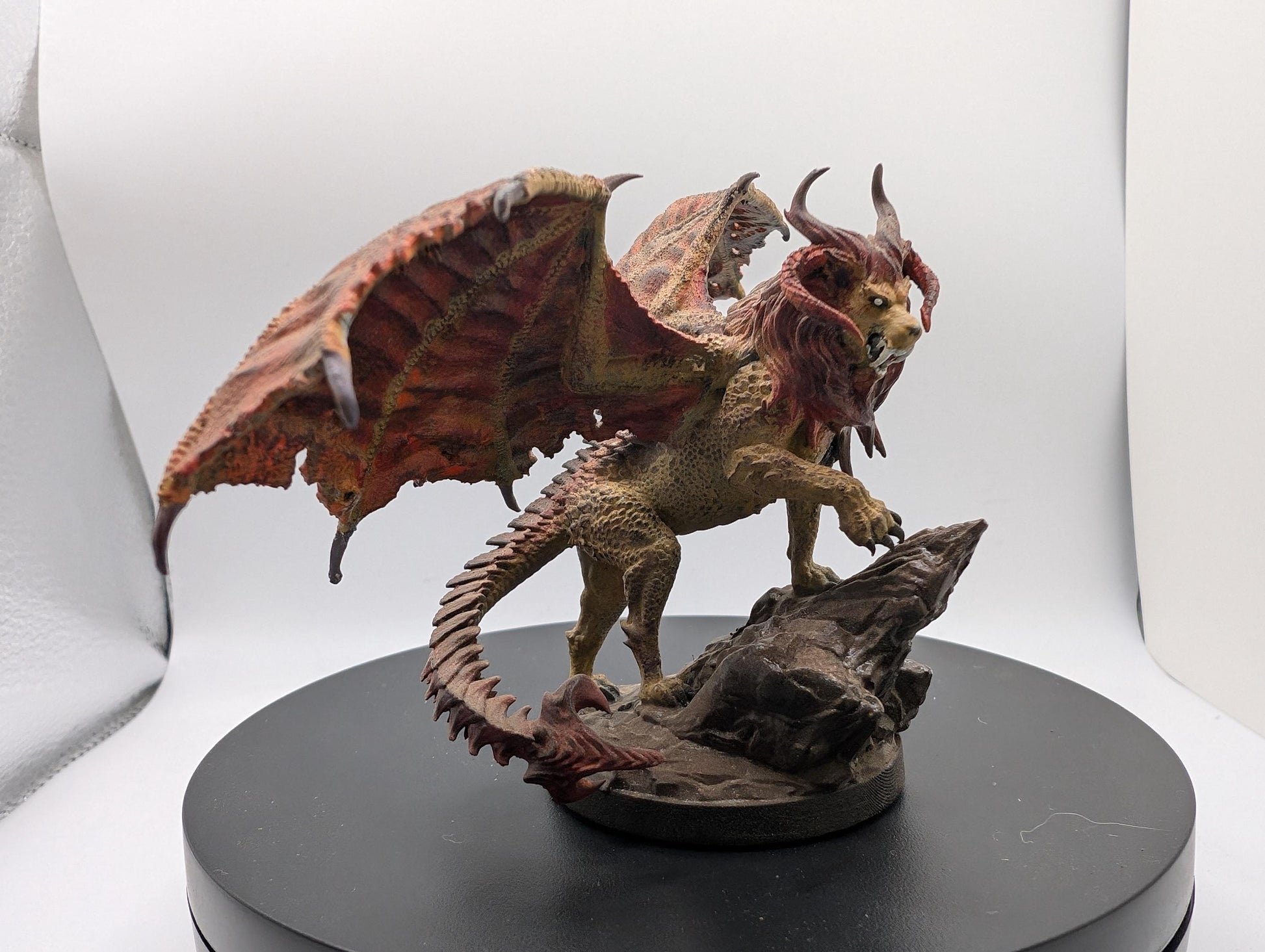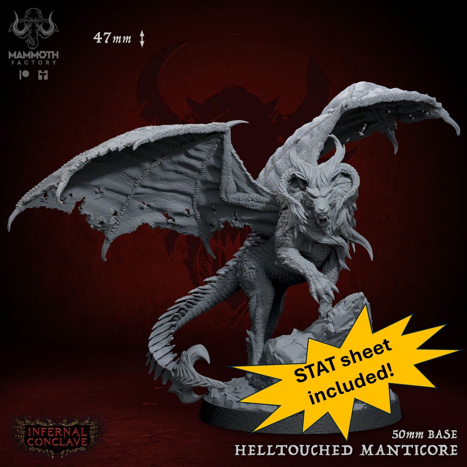 Manticore's are creatures of legend, with parts consisting of lion, dragon, and scorpion. This monstrosity comes as a 47 mm Scale Manticore with a Custom 50mm Base