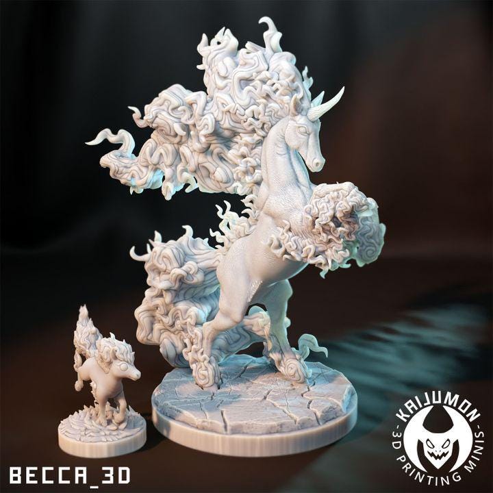 These realistic and stylized fire-horse monsters are waiting for adventure. This set includes the small "pony" and the evolved "rapid horse" minis. The large horse is on a 50 mm base.