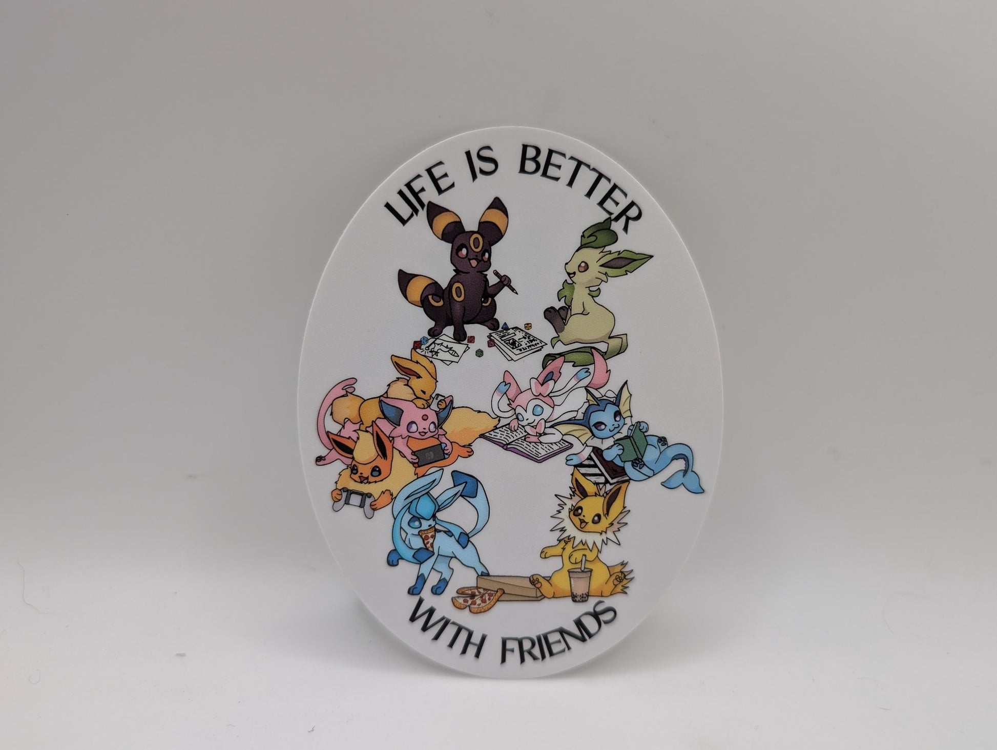 Friendship is unquestionably one of the best parts of life! These adorable pocket monster evolutions are enjoying one another's company - whether playing video games, reading together, snacking and chatting, or enjoying a role-playing game! Celebrate friendship by sharing this sticker with your own friend group!