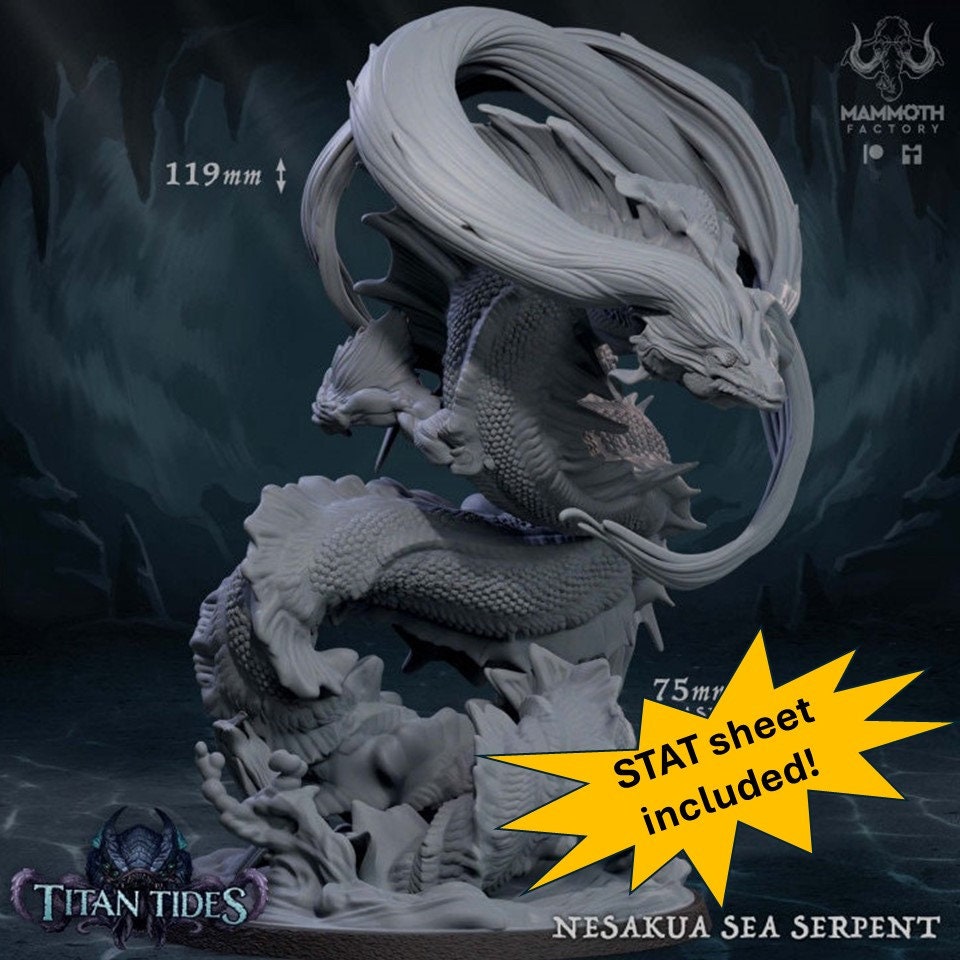 This elegant sea serpent will make an ominous mystical adversary for your adventuring party, or just make a beautiful adornment to your desk. This figure includes the Nasakua Sea Serpent - 32mm Scale (prints in 2 parts with easy alignment markers to the figure and base) and the Custom Base - 75mm. This puts this towering "mini" at about 5 inches tall.