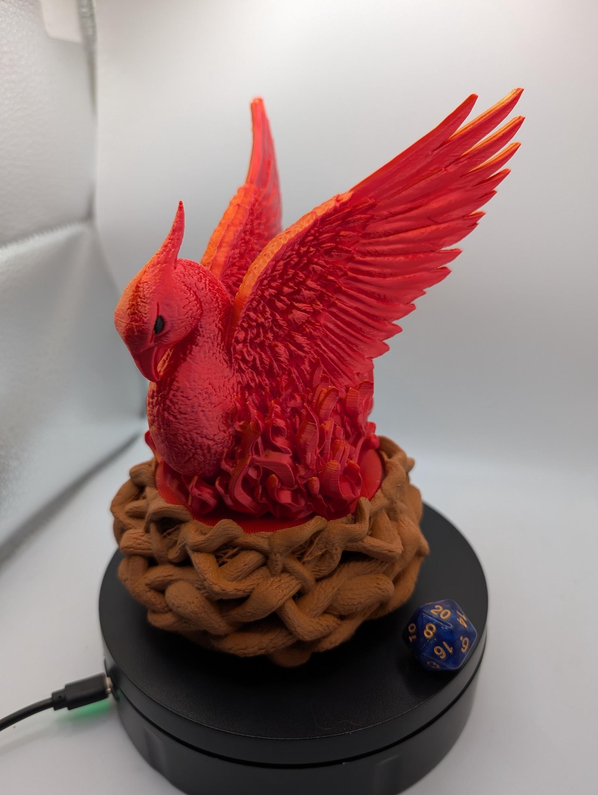 This majestic phoenix surrounded by flames atop his nest will surely protect your dice (or keys, trinkets, candy, etc). The phoenix half ("lid") fits comfortably on top but has small recesses to insert small magnets if desired. Whether used as dice storage, or a powerful "dice jail", he is sure to be an incredible addition to the table.