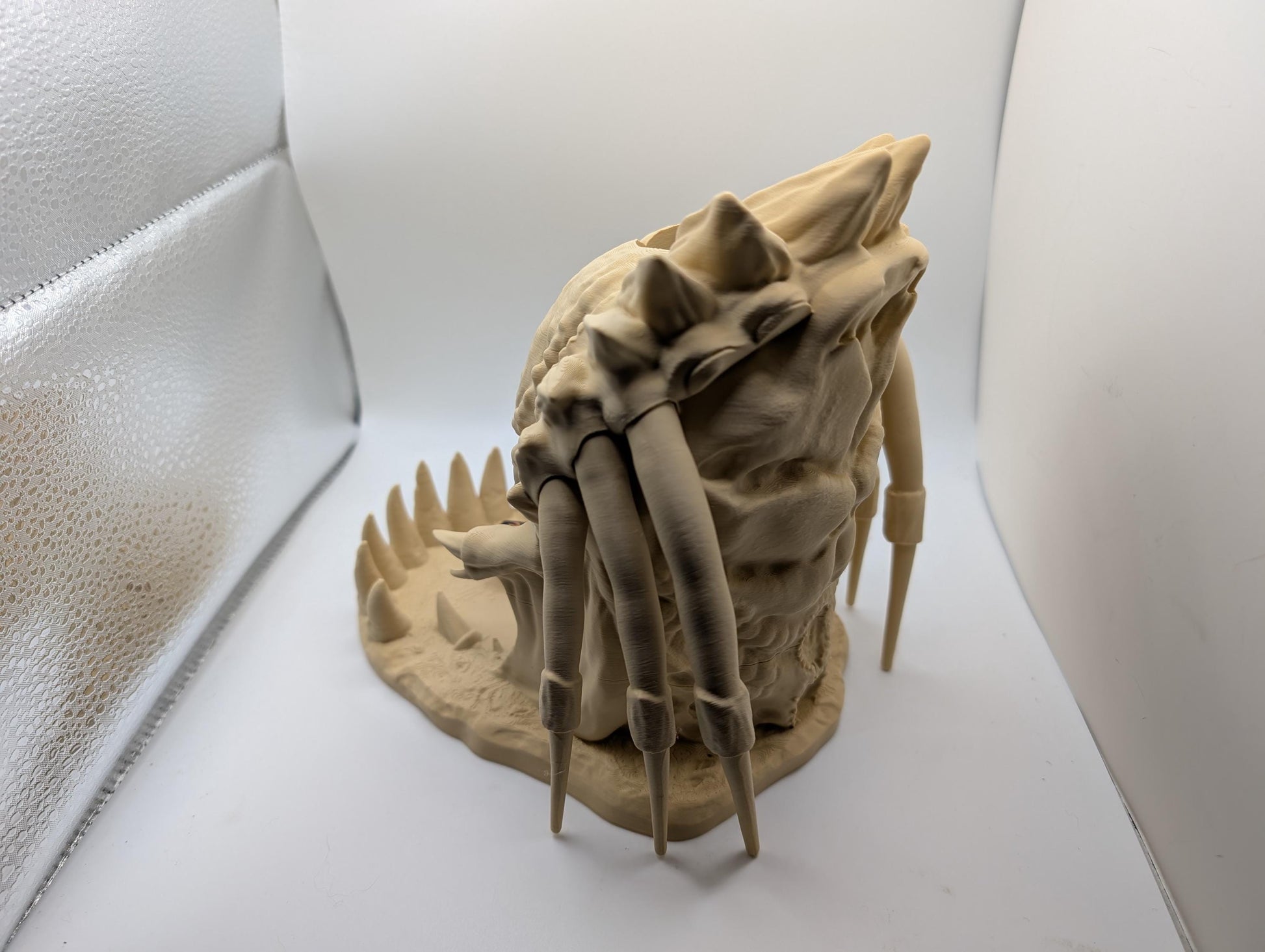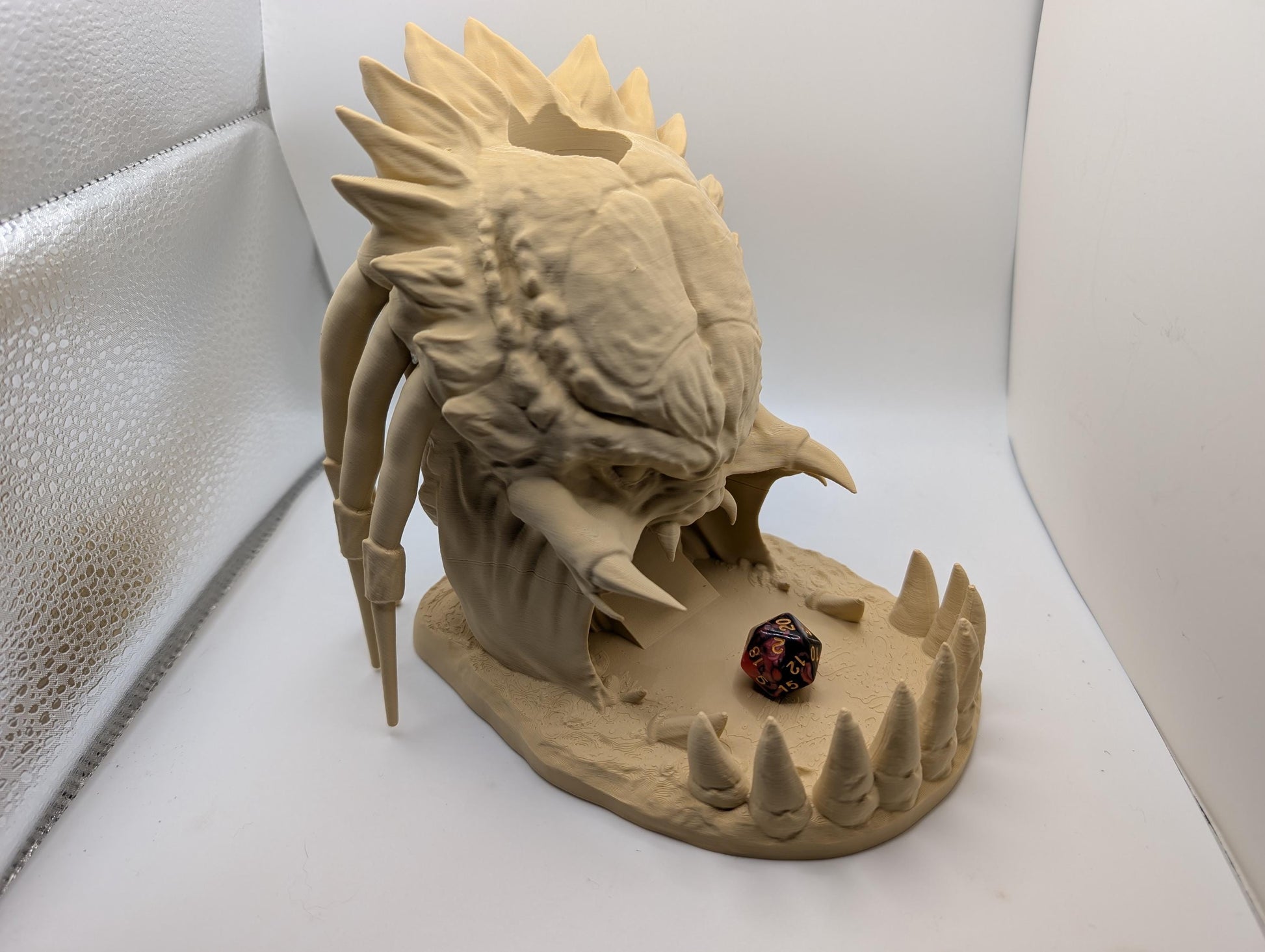 This Predator-inspired dice tower is an impressive and unique dice tower that will be a great addition to your adventure! Dice are rolled from the top, ending in the tray below the mouth. It can accommodate standard-sized dice (22 mm) and larger (28 mm) dice, such as the popular liquid core dice. This tower stands about 7 inches tall, with an approximately 7 x 5 inch base (the side tendrils make it closer to 7 x 6 inches).