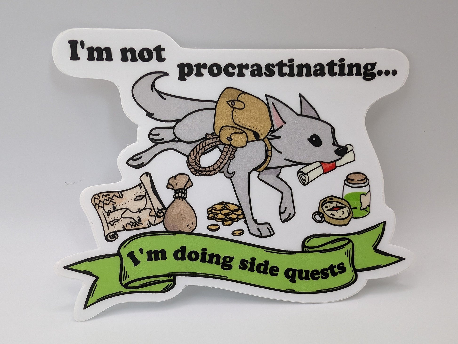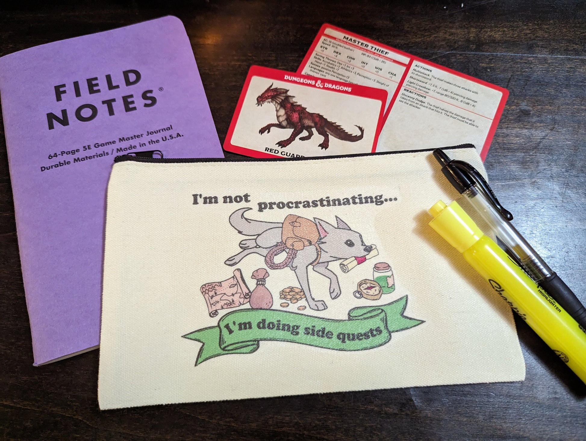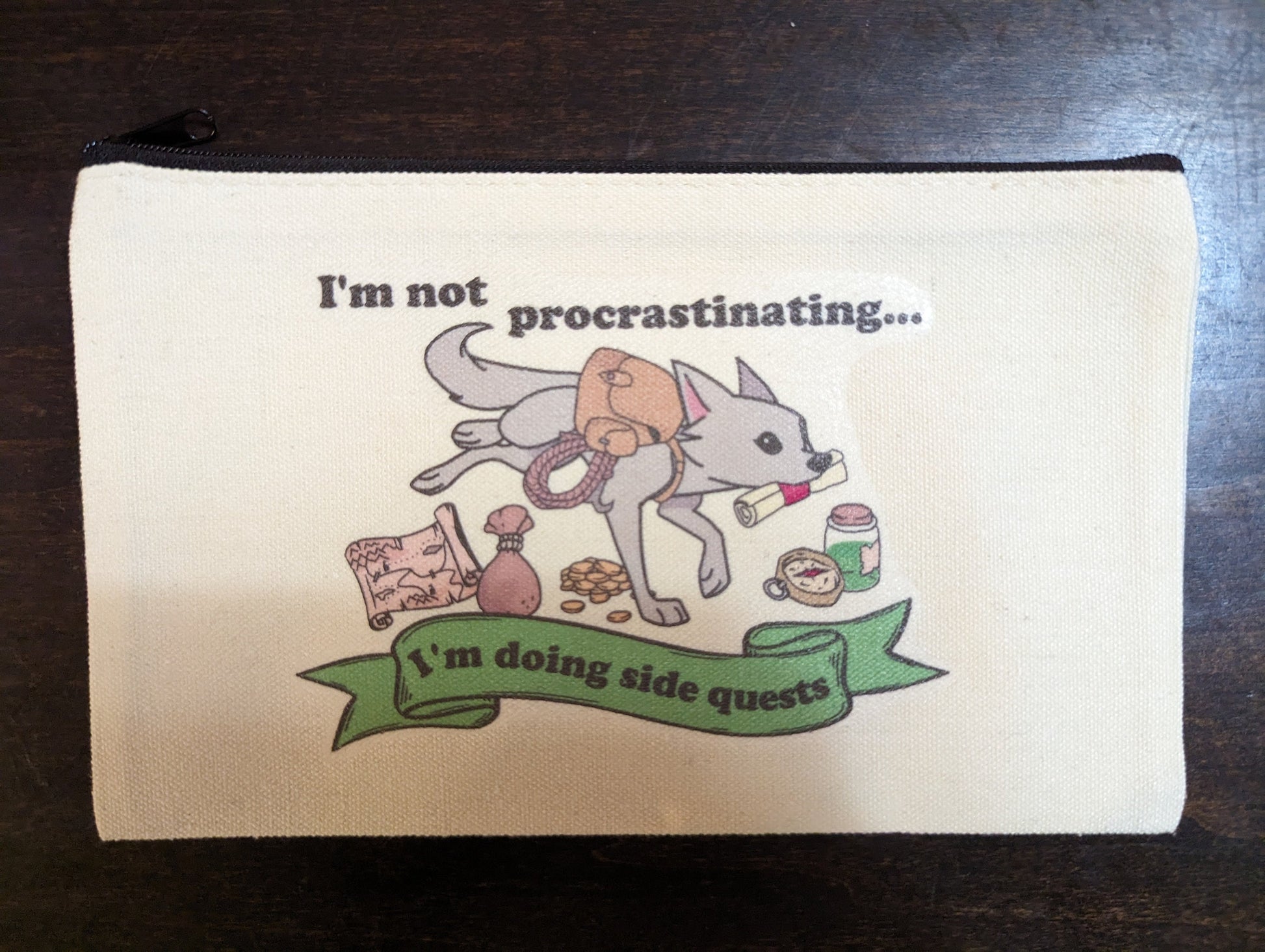 Procrastinate, me? Never! I'm simply doing side quests. A must-have for all adventuring parties that find themselves distracted by other equally important adventures! Our nerdy canvas storage bags can be used to hold anything from snacks, makeup, dice, pencils, travel items, and more. They are hand-made and measure 5 x 8.5 inches and close with a zipper.