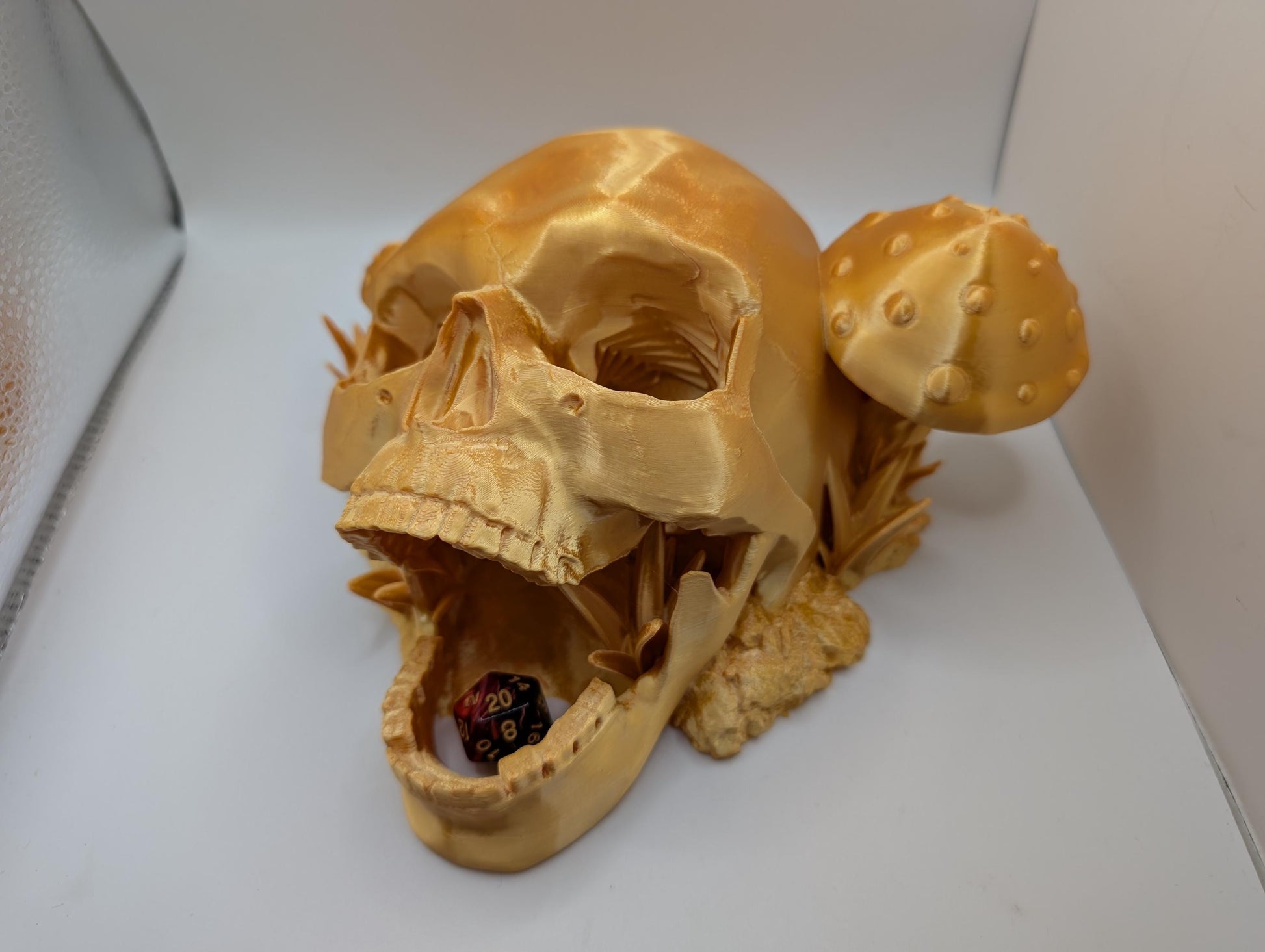 This skull surrounded by plants and mushrooms is a fun and unique dice tower that will be a great addition to your adventure! Dice can be rolled through either socket, ending in the lower jaw. It can accommodate standard-sized dice (22 mm) and larger (28 mm) dice, such as the popular liquid core dice. The tower is about 4.5 inches tall and an approximately 6 x 6.5 inch base.