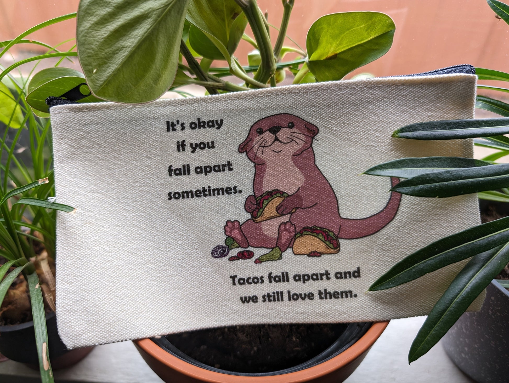 As a San Diego shop, we all live tacos. Even when they are falling apart and making a mess, they are delicious. This cute little otter reminds us it's ok to fall apart, like a taco. Our nerdy canvas storage bags can be used to hold anything from snacks, makeup, dice, pencils, travel items, and more. They are hand-made and measure 5 x 8.5 inches and close with a zipper.
