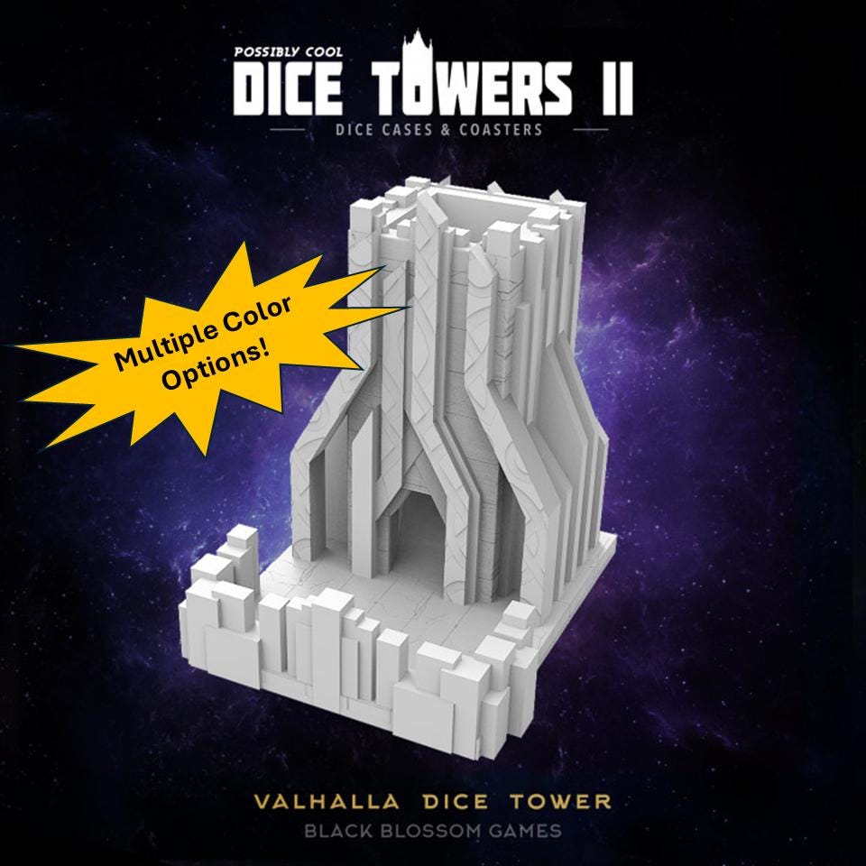 This symmetrical and powerful dice tower will be a great addition to your adventure! Dice are rolled from the top, ending in the center of the wreckage. It can accommodate standard-sized dice (22 mm) and larger (28 mm) dice, such as the popular liquid core dice. It stands at 6.5 inches tall, with an approximately 7 x 5.5 inch base.