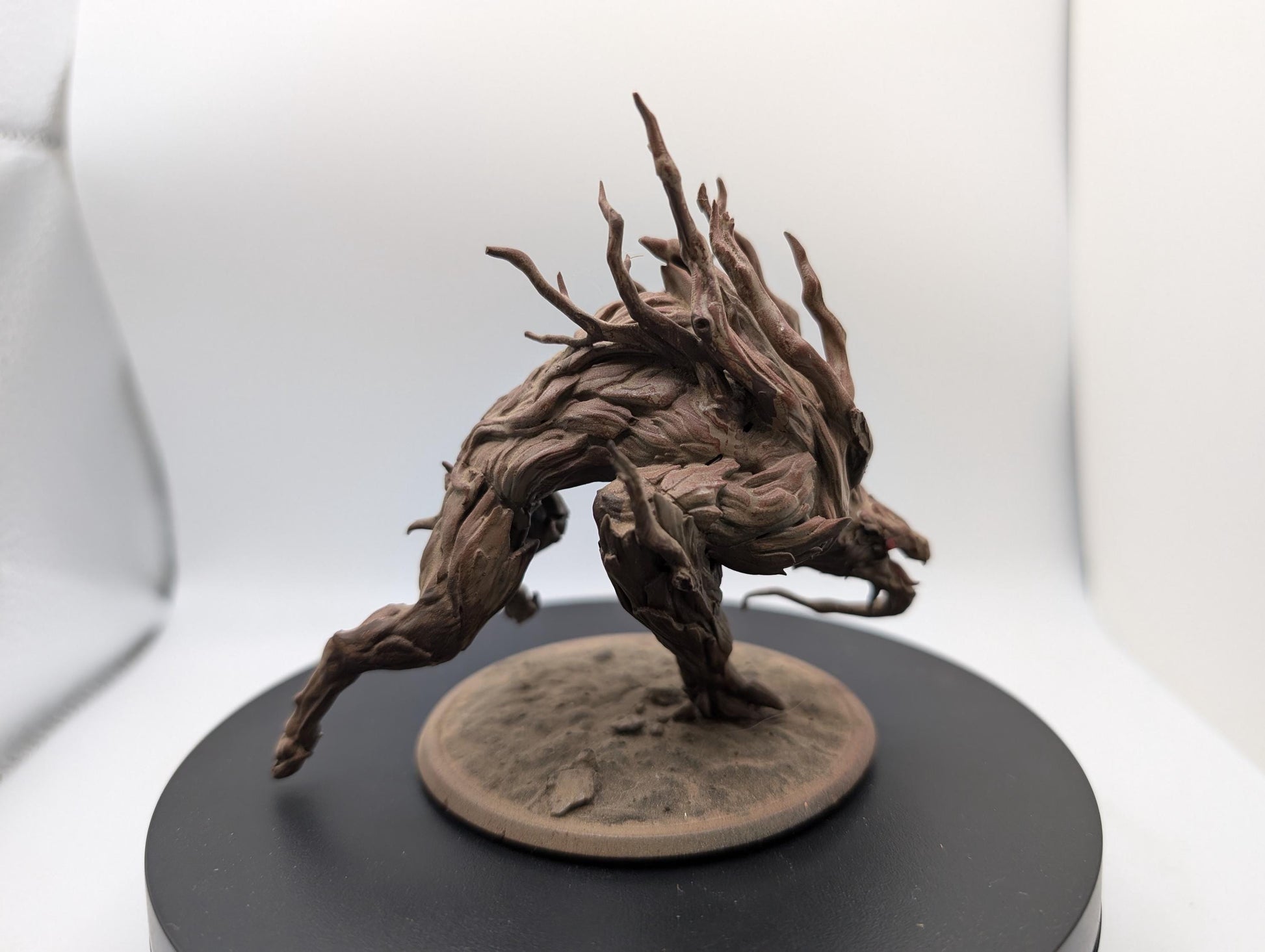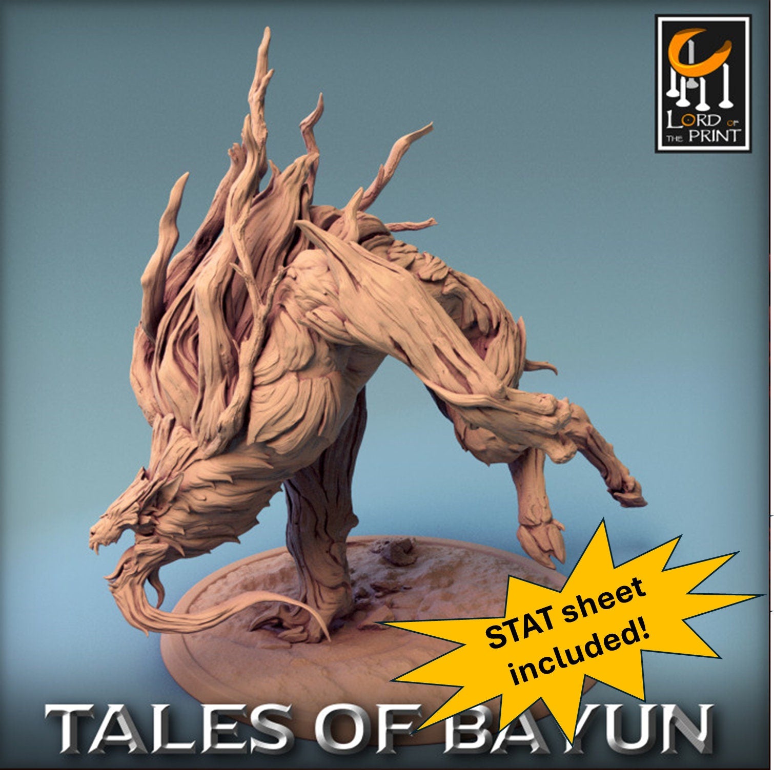 Although he appears to be made of wood and branches, this "wood wolf" monstrosity would be a terrifying sight in the darkly lit forest. Travelers beware as you pass through the forest on a full moon. This object is printed on a Custom 75mm Base.