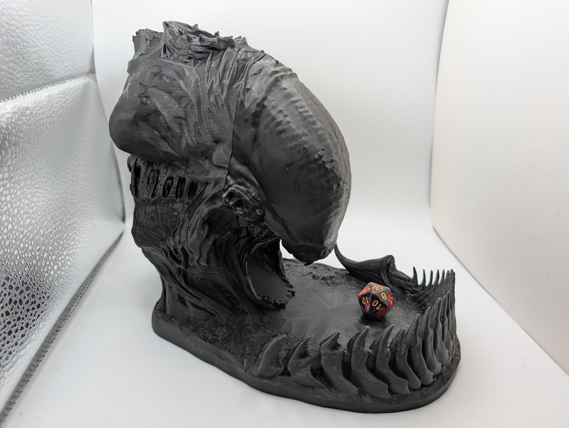 This Xenomorph-inspired dice tower is an impressive and unique dice tower that will be a great addition to your adventure! Dice are rolled from the back, ending in the tray below the mouth. It can accommodate standard-sized dice (22 mm) and larger (28 mm) dice, such as the popular liquid core dice. This tower stands about 7.25 inches tall, with an approximately 7.75 x 5 inch base.